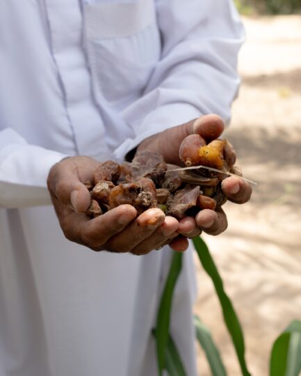 Ma’souma holds synthetic dye crystals locally referred to as qurmoz, Al Julayjilah palm farm, Al-Ahsa. Photo: Latifa AlBokhari