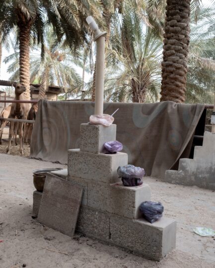 Synthetic aniline dye crystals used to color palm fibers, stacked on concrete blocks in a palm grove in Al-Julayjilah, Al-Ahsa. Photo: Latifa AlBokhari