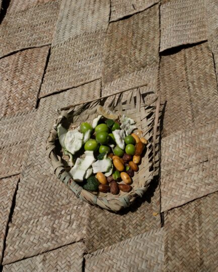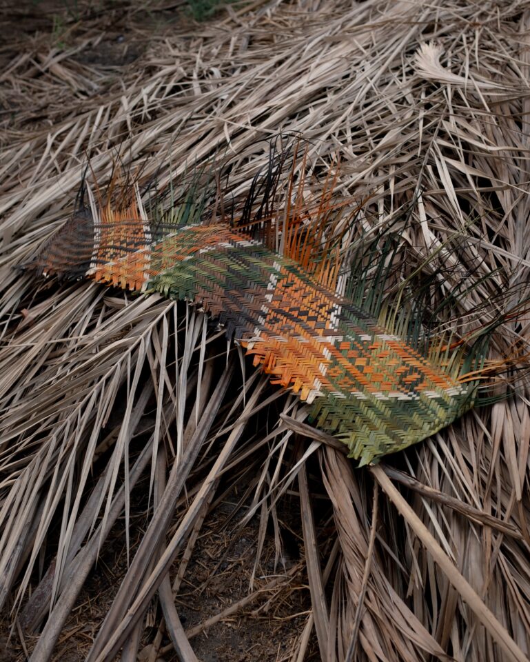 The bright yellows of the palm’s youth interlace with synthetic greens, brittle browns, and deep oranges. The chemically altered tones saturate the dry natural fiber where tradition meets the contemporary world. These woven forms reveal how objects continue to emerge from mutation and ending, mapping a way to live with what is already there: altered, reconfigured, and intensely alive.